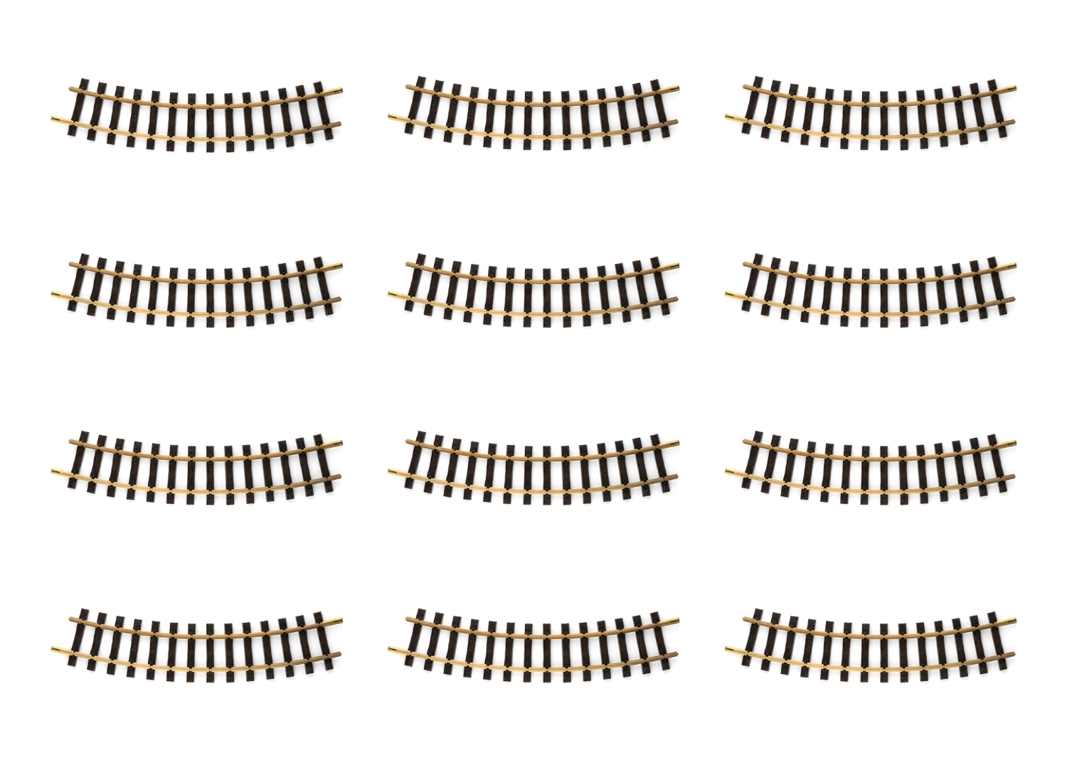 Kurven im Radius R2 ermöglichen einen realistischen Betrieb mit langen Zügen. 12 Gleise im Radius R2 mit einem Winkel von 30° ergeben einen Kreis (360°).