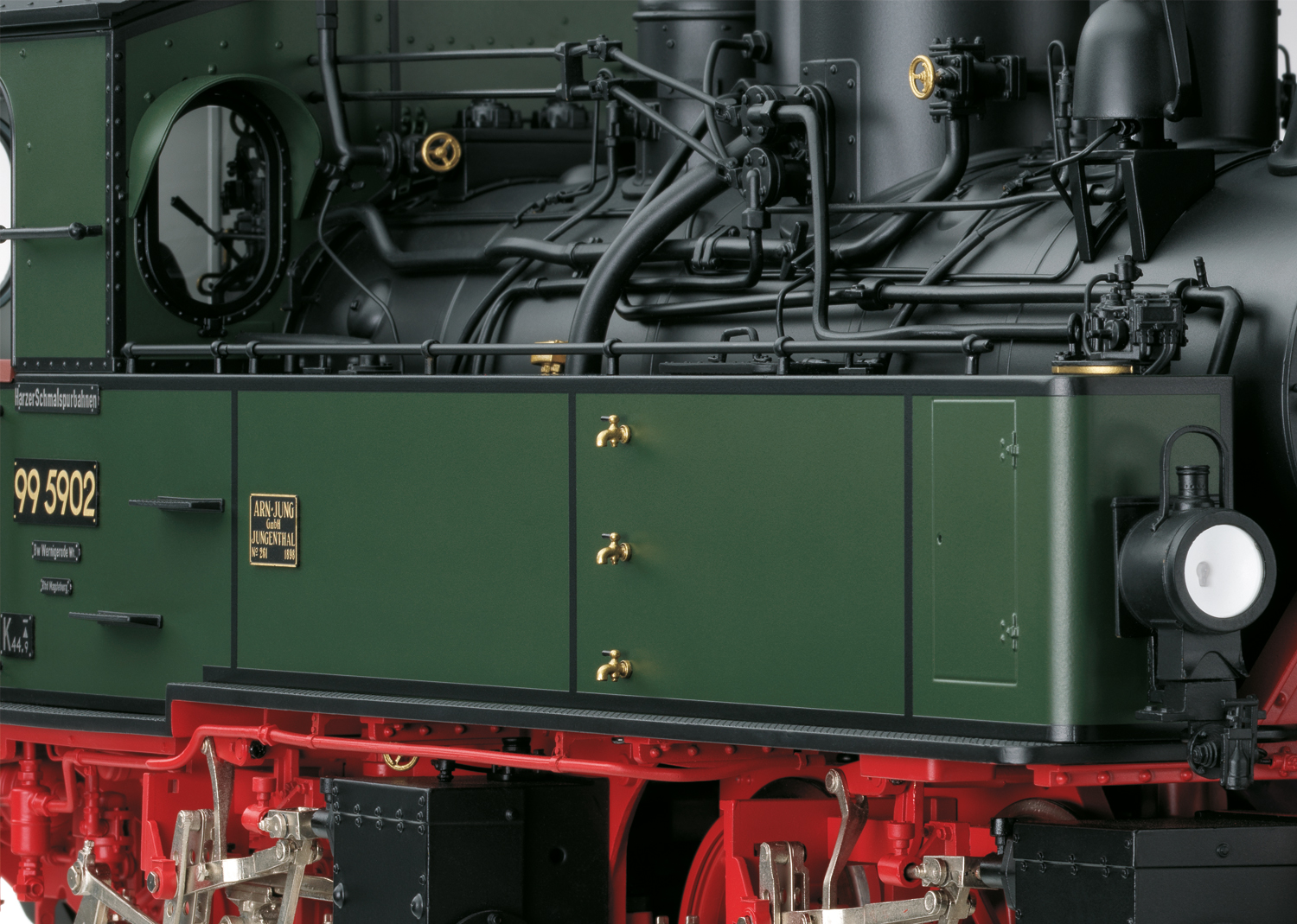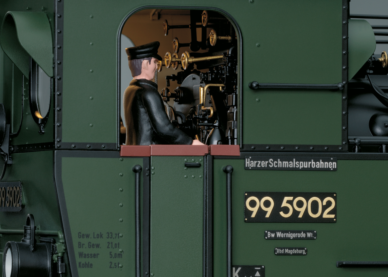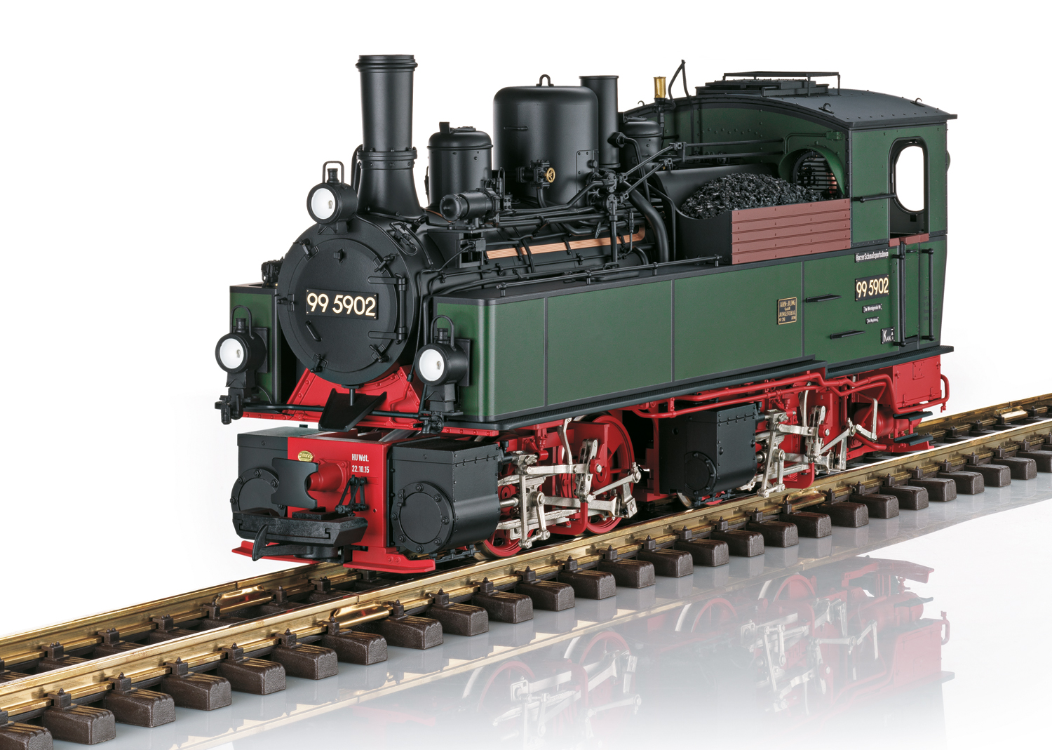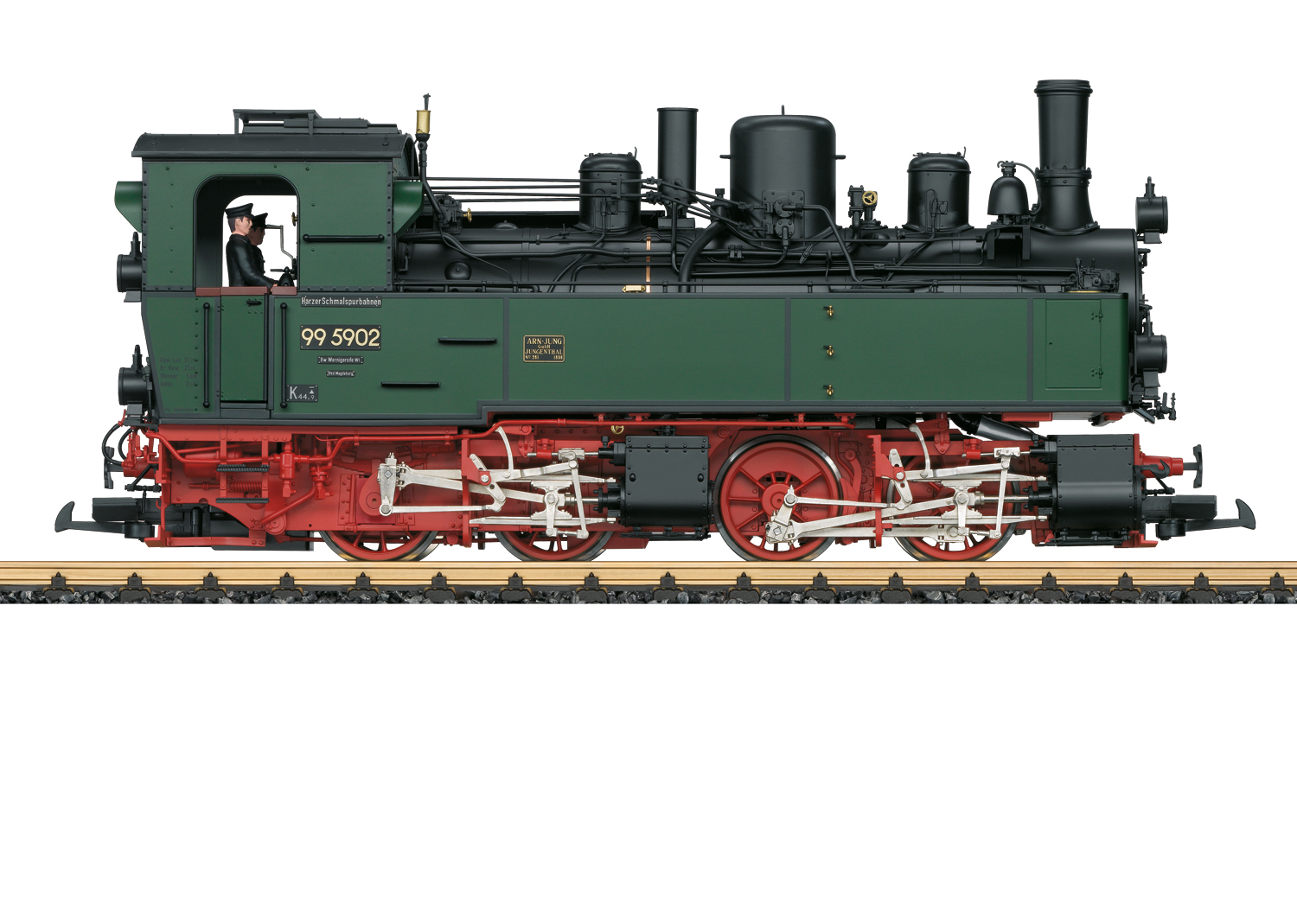 Modell: Modell der Dampflok 99 5902 der Harzer Schmalspurbahnen. Feindetailliertes Modell in schwerer Metallbauweise mit vielen angesetzten Details. Antrieb mit zwei Hochleistungsmotoren, alle Treibradsätze über Kuppelstangen angetrieben. Türen zum Führerstand und Rauchkammertür zum Öffnen. Feindetailliertes Fahrwerk der Bauart Mallet mit vielen Details wie komplettes Gestänge und Antrieb der Schmierpumpe. Originalgetreue grün/schwarz/rote Farbgebung und Beschriftung der Epoche VI, so wie die Lok heute noch bei der HSB vorhanden ist. Ausgerüstet mit einem mfx/DCC-Decoder mit vielen Licht- und Soundfunktionen wie Spitzenlicht, Führerstandsbeleuchtung, Fahrgeräusch, durch Reedschalter auslösbare Pfeife und Glocke sowie vieles mehr. Fahrgeräusch auch im Analogbetrieb funktionsfähig. Eingebauter Rauchgenerator mit radsynchronem Dampfausstoß sowie Zylinderdampf und Dampfausstoß an der Pfeife, wenn diese betätigt wird. An beiden Enden digital schaltbare LGB-Systemkupplungen, diese können demontiert werden. Federpuffer. Länge über Puffer 40 cm.