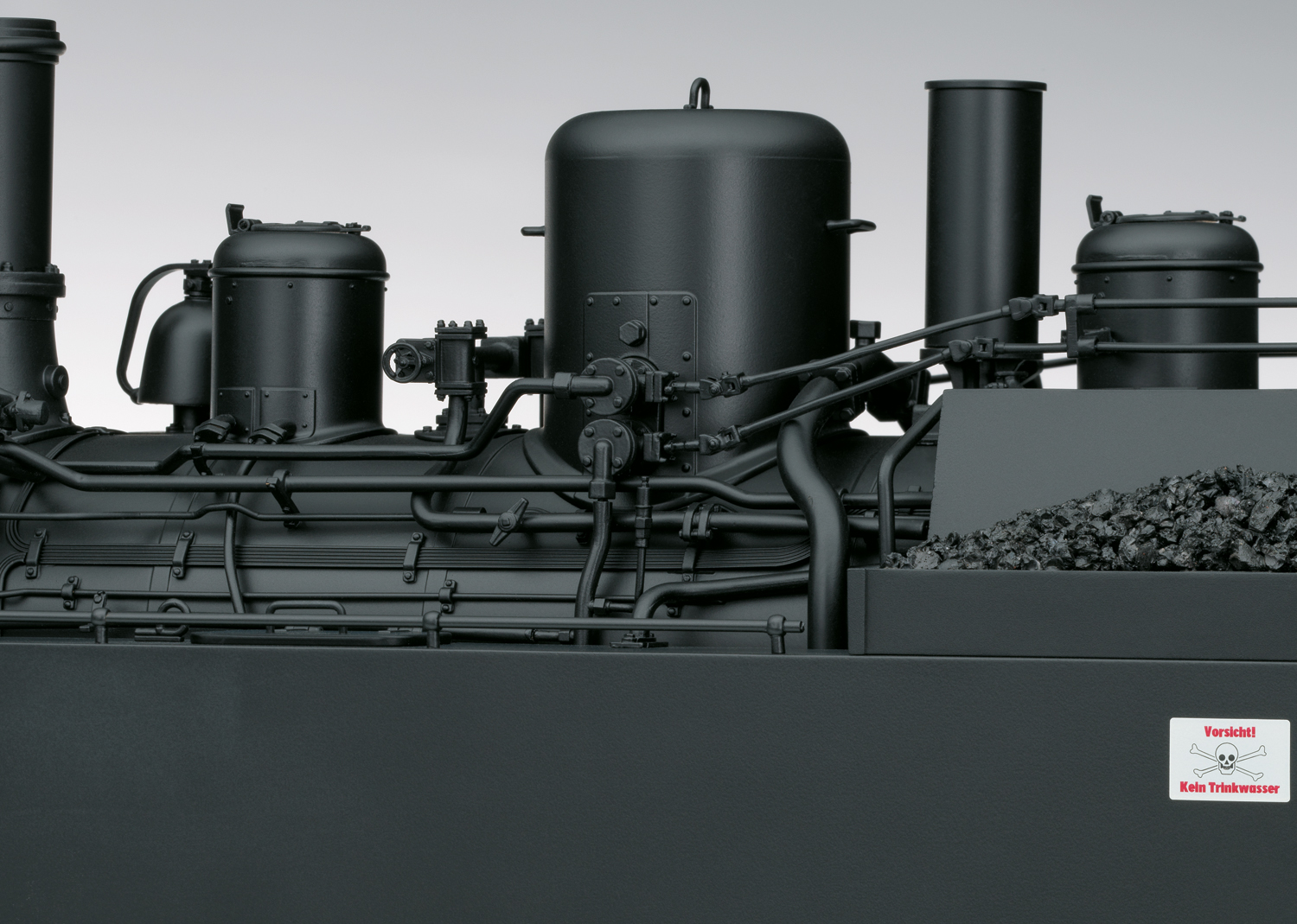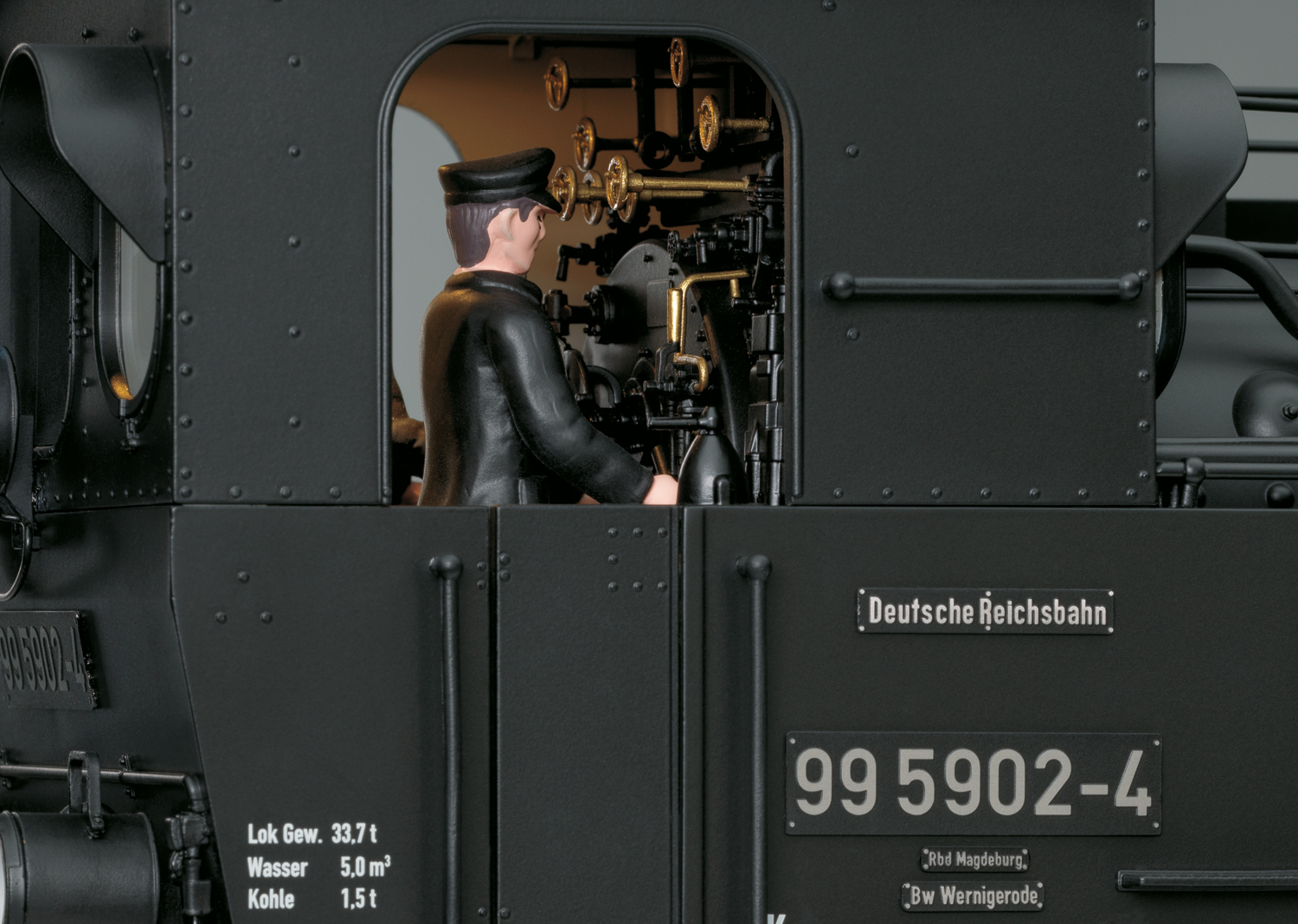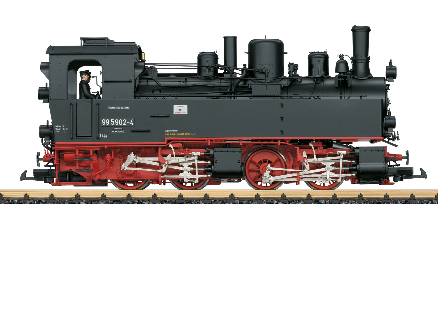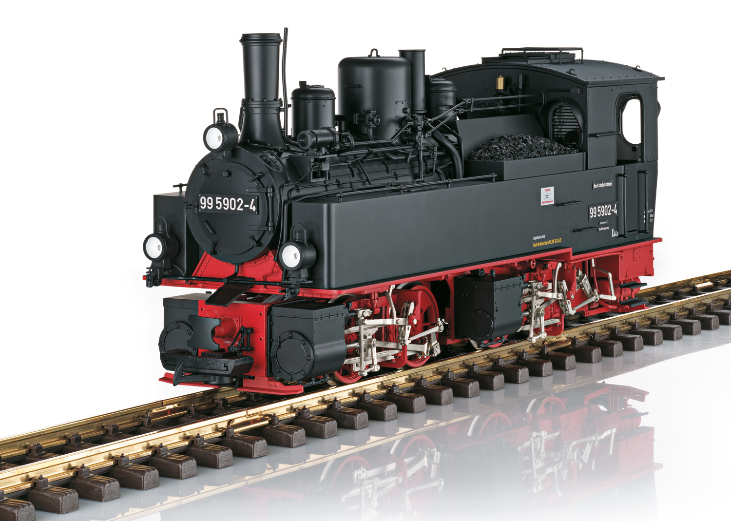 Modell: Modell der Dampflok 99 5902 der Deutschen Reichsbahn. Feindetailliertes Modell in schwerer Metallbauweise mit vielen angesetzten Details. Antrieb mit zwei Hochleistungsmotoren, alle Treibradsätze über Kuppelstangen angetrieben. Türen zum Führerstand und Rauchkammertür zum Öffnen. Feindetailliertes Fahrwerk der Bauart Mallet mit vielen Details wie komplettes Gestänge und Antrieb der Schmierpumpe. Originalgetreue schwarz/rote Farbgebung und Beschriftung der Epoche IV, so wie die Lok damals bei der DR im Einsatz war. Alle Unterschiede gegenüber der Version der Lok in der heutigen Version sind nachgebildet, so hat das Modell - so wie das Original - keine Luftpumpe, da es mit einer Vakuumpumpe ausgerüstet war. Auch die unterschiedliche Leitungsführung am Kessel ist originalgetreu nachgebildet. Ausgerüstet mit einem mfx/DCC-Decoder mit vielen Licht- und Soundfunktionen wie Spitzenlicht, Führerstandsbeleuchtung, Fahrgeräusch, durch Reedschalter auslösbare Pfeife und Glocke sowie vieles mehr. Fahrgeräusch auch im Analogbetrieb funktionsfähig. Eingebauter Rauchgenerator mit radsynchronem Dampfausstoß sowie Zylinderdampf und Dampfausstoß an der Pfeife, wenn diese betätigt wird. An beiden Enden digital schaltbare LGB-Systemkupplungen, diese können demontiert werden. Federpuffer. Länge über Puffer 40 cm.
