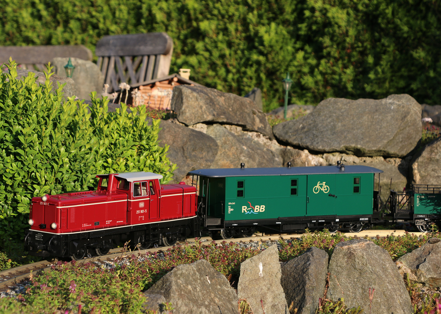 Modell: Diesellokomotive BR 251. Diese Maschine wurde ursprünglich im August 1964 bei der DB für 750 mm Schmalspur in Betrieb genommen. Aktuell ist die Maschine in Putbus auf Rügen bei der RüBB. Diese Lok hat ein neues Farbkleid in altroter Farbe bekommen mit einer Beschriftung um 1968. Achsfolge B´B´. Ausgerüstet mit einem mfx/DCC-Decoder mit vielen Licht- und Soundfunktionen. Energiespeicher eingebaut. Alle Achsen angetrieben. Haftreifen. In Fahrtrichtung wechselnde Beleuchtung, Führerstandsbeleuchtung, Führerstandstüren zum Öffnen. Länge über Puffer 43,6 cm.