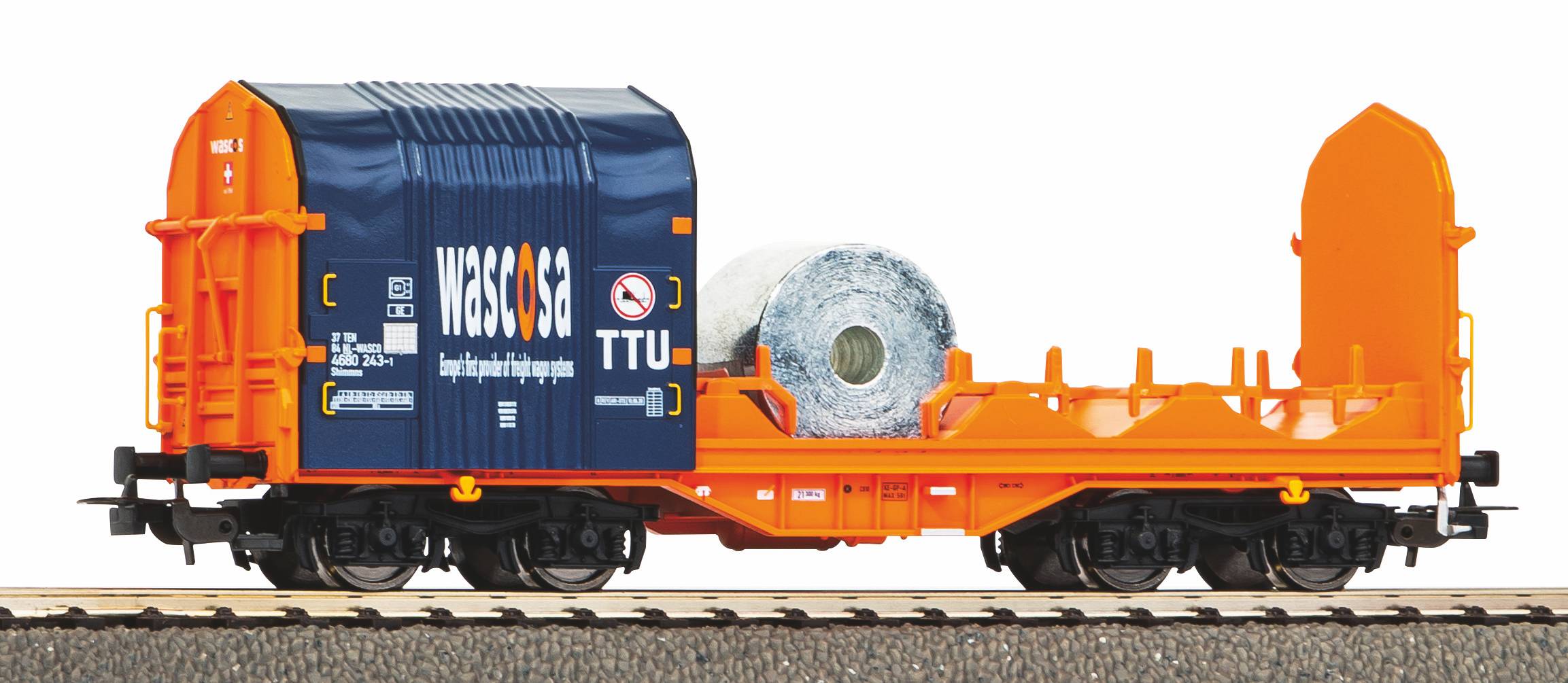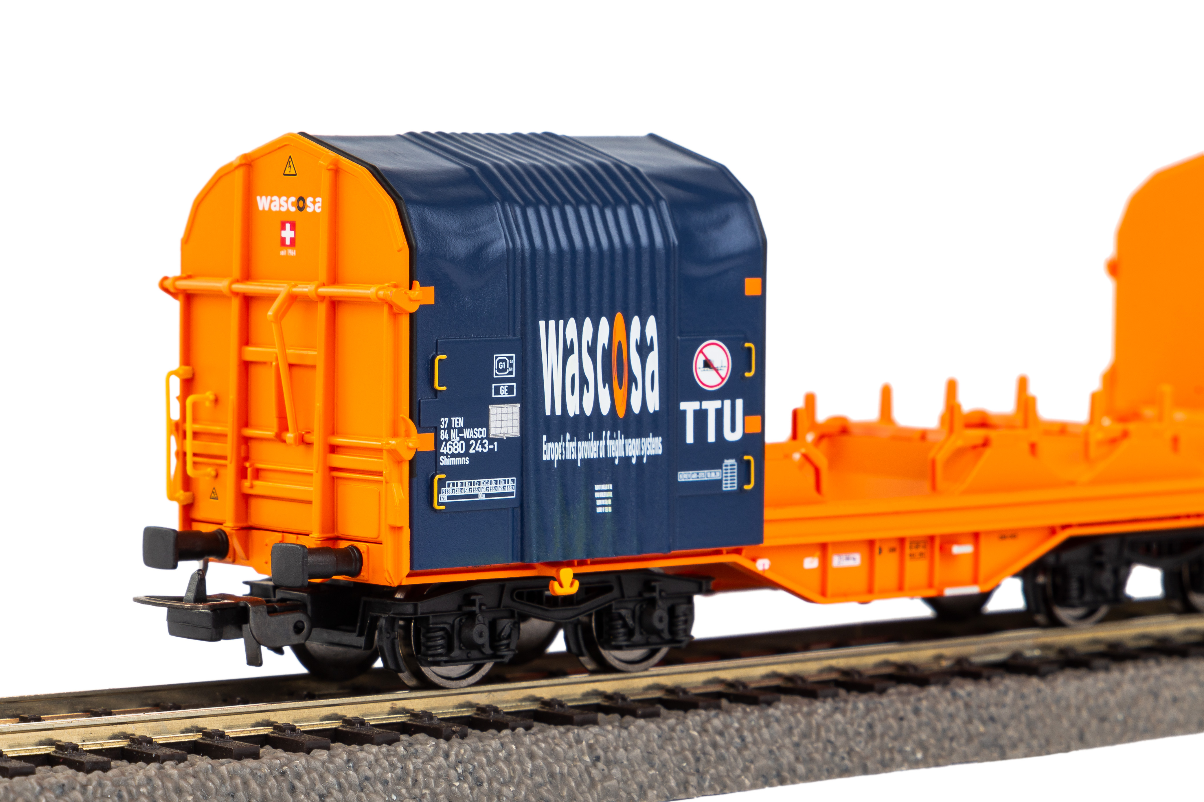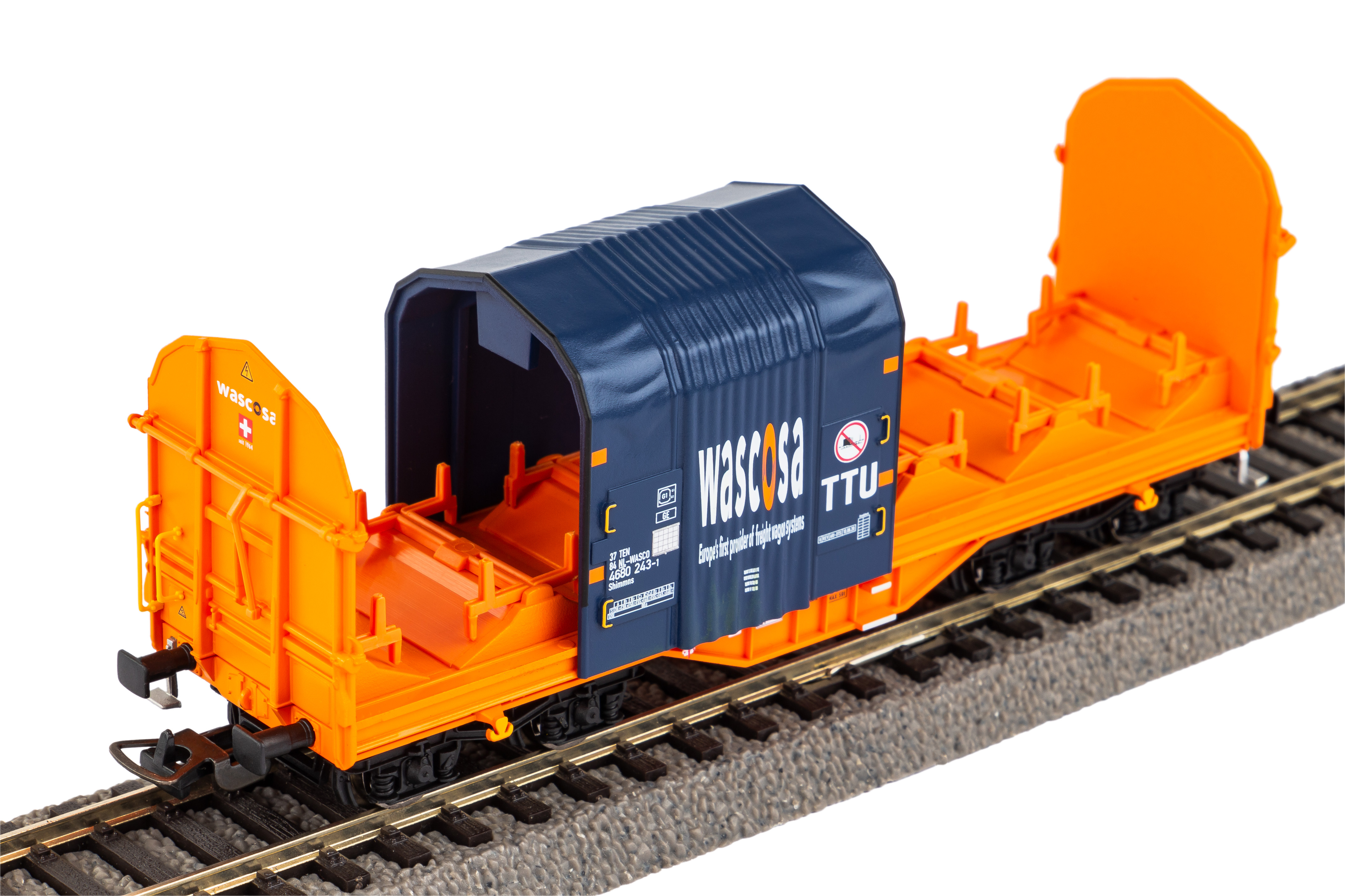 Schiebeplanenwagen Wascosa mit geöffneter Plane, Epoche VI. Tauschradsätze für Wechselstrom finden sich unter der Artikelnummer 56061.