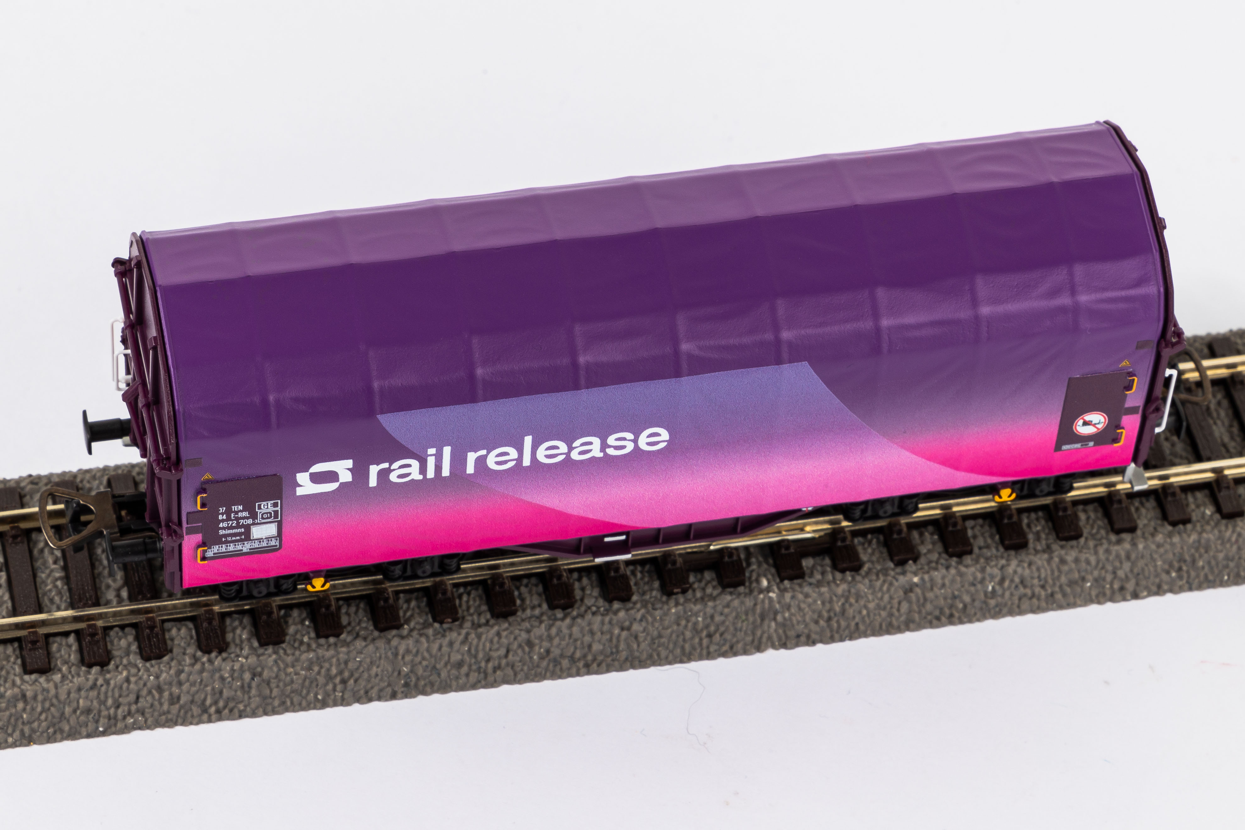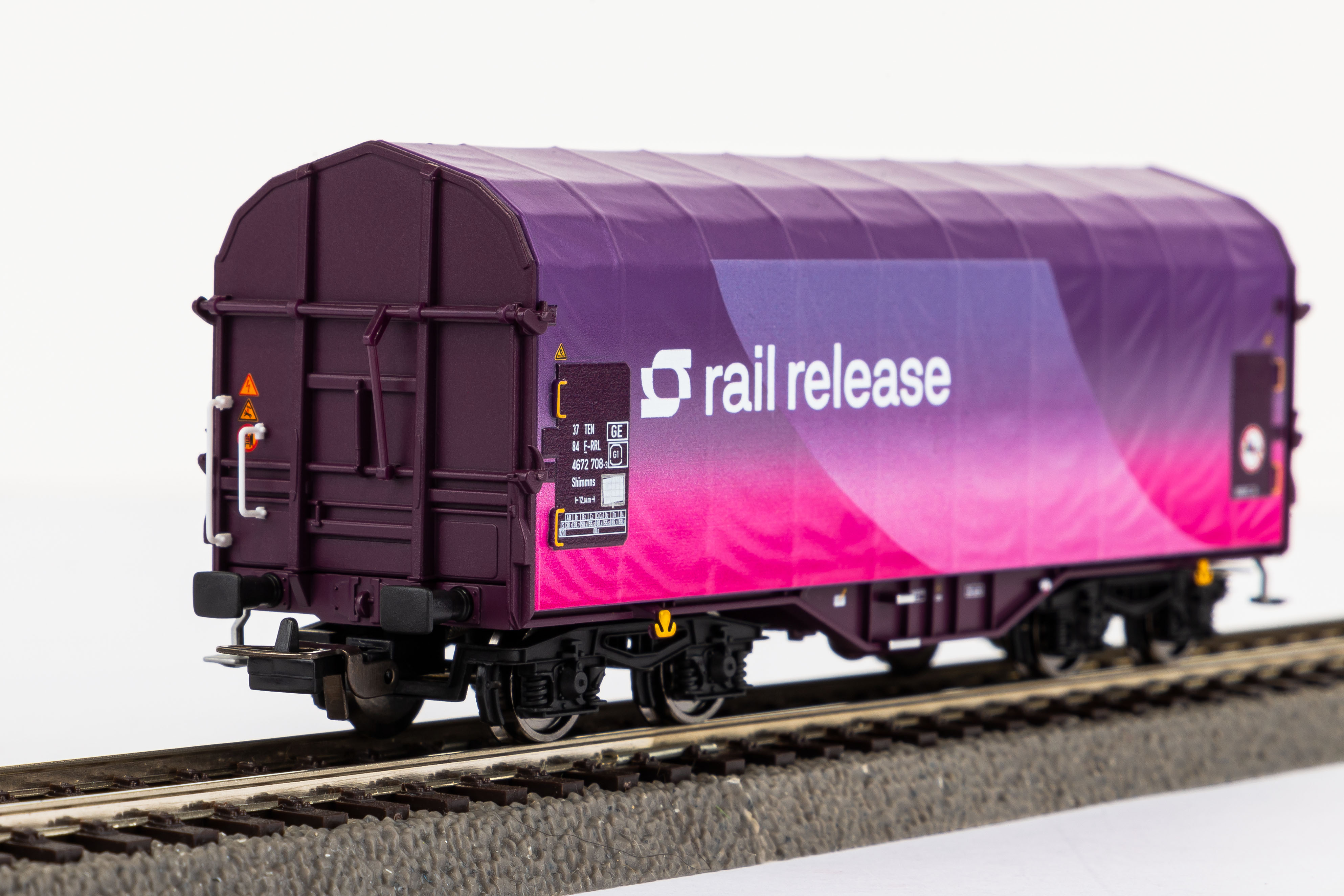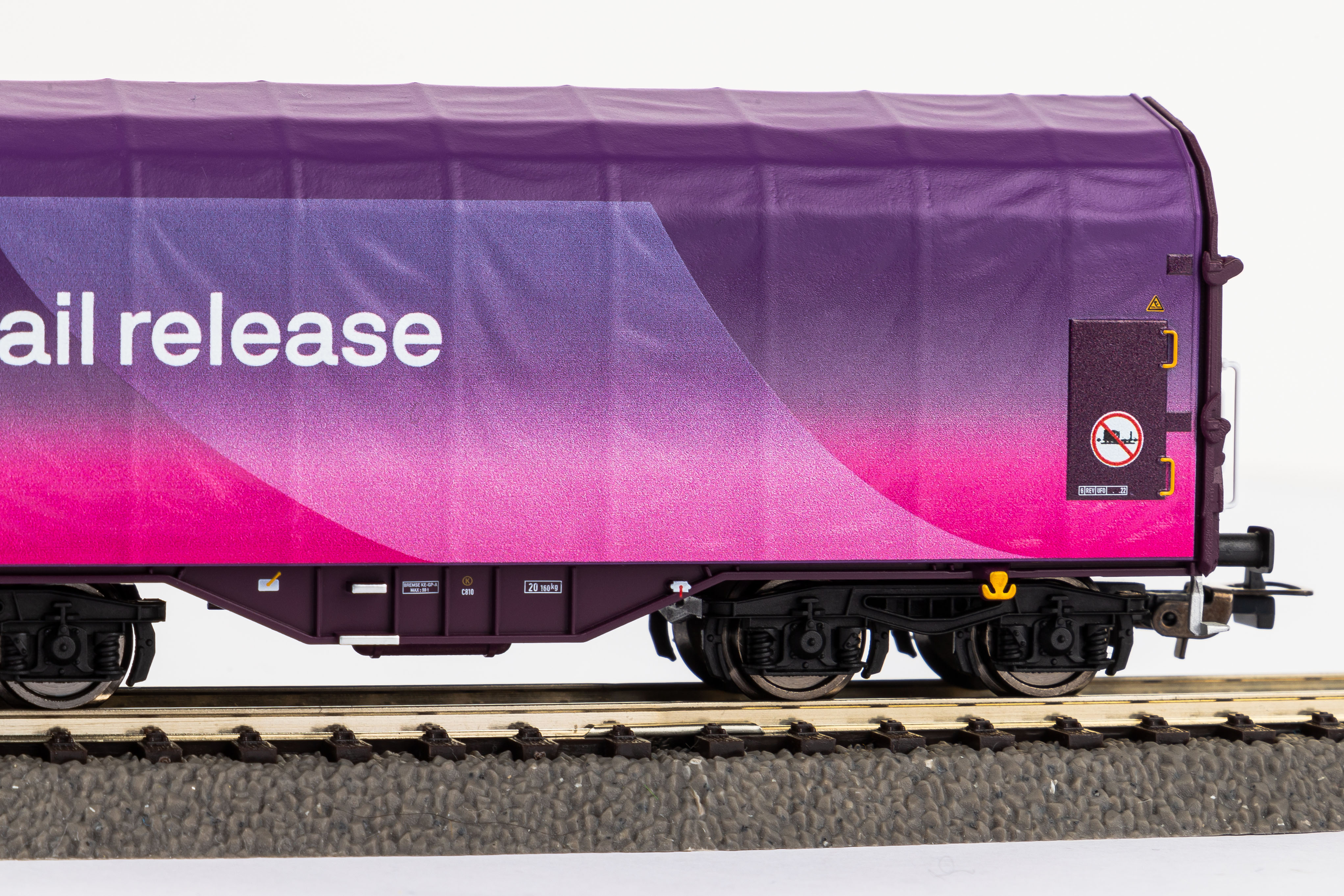 Schiebeplanenwagen im Design Rail Release in Epoche VI. Tauschradsätze für Wechselstrom finden sich unter der Artikelnummer 56061.