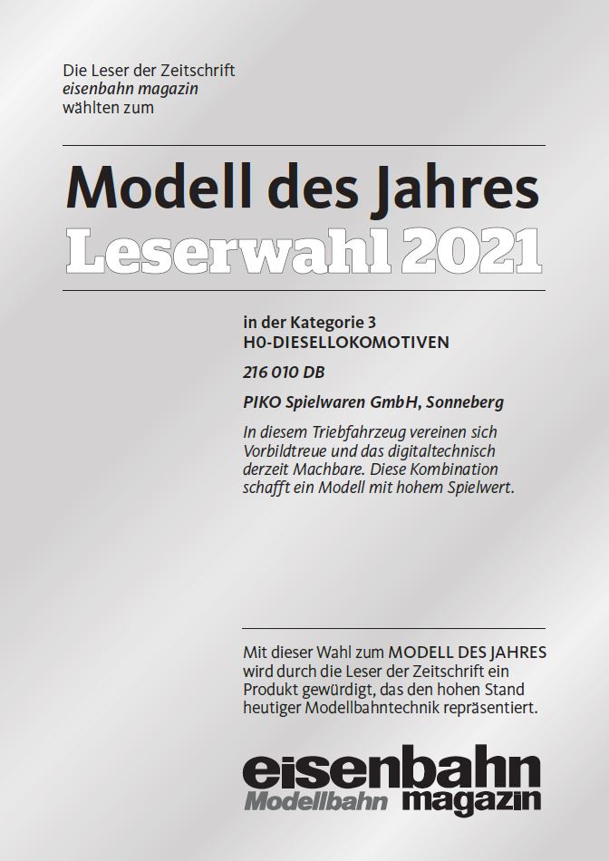 Artikelbezeichnung Sound-Diesellok BR 216 DB IV Wechselstromversion, inkl. PIKO Sound-Decoder
