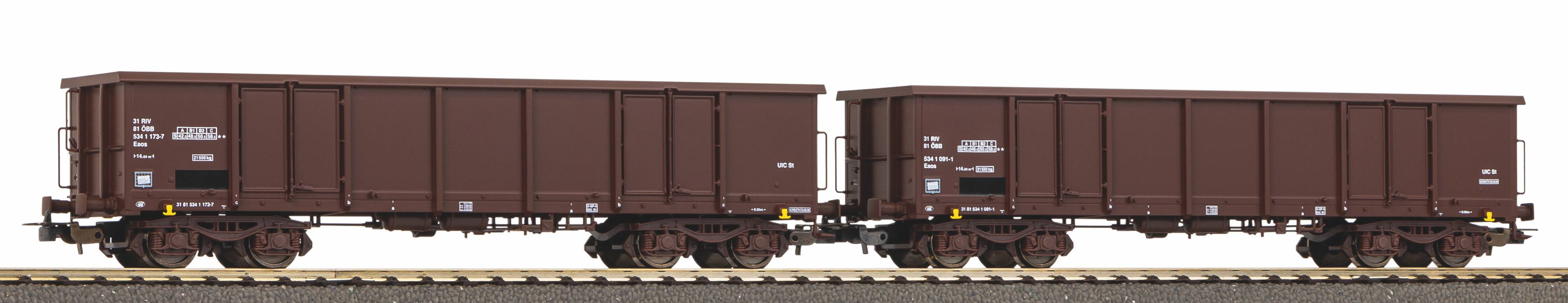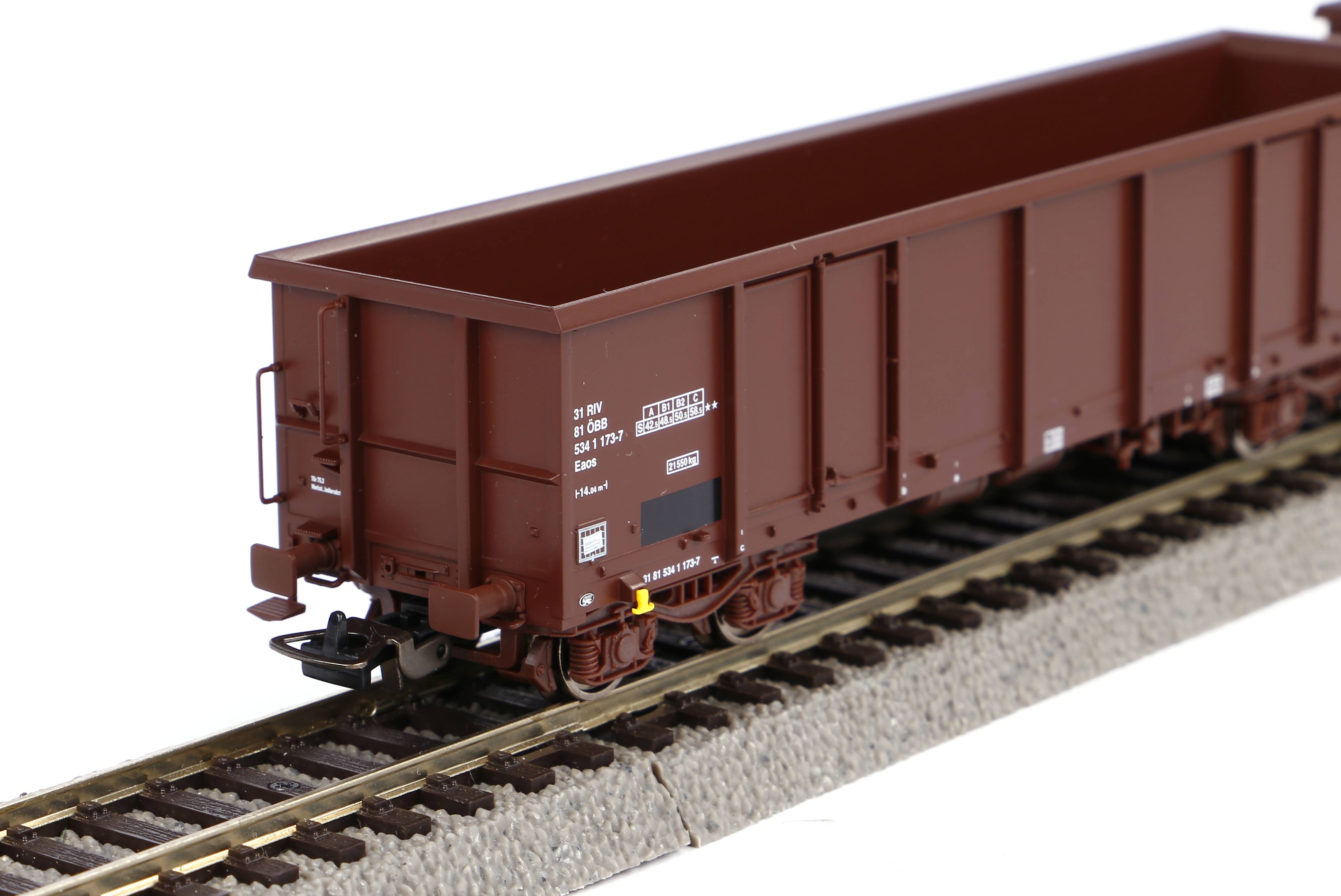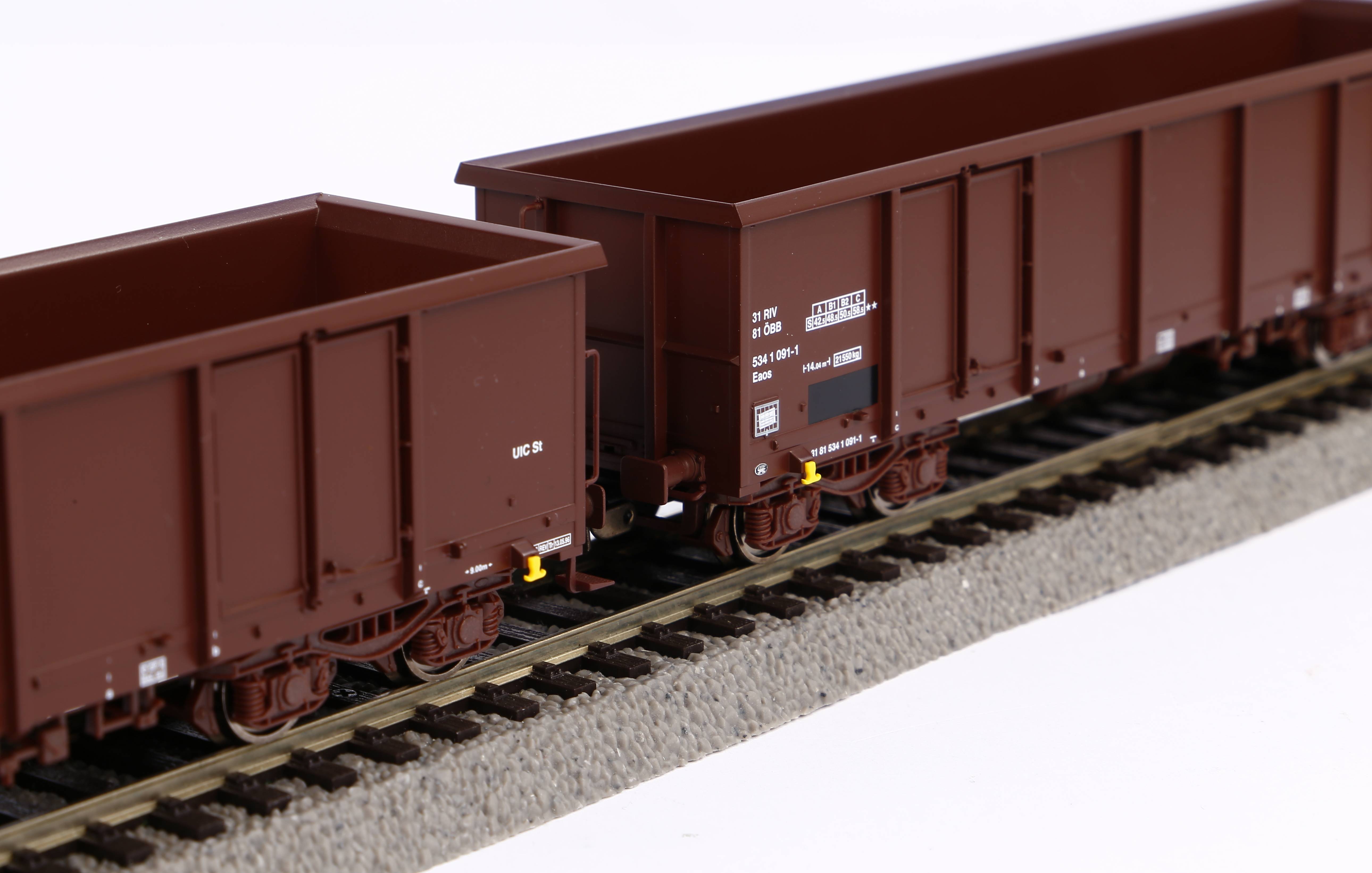 Modell: Zweierset bestehend aus zwei offenen Güterwagen vom Typ Eaos der ÖBB aus Epoche V. Wie das Vorbild ist der Eaos auch im Modell ein Fahrzeug mit hoher Verbreitung und sollte auf jeder Modellbahnanlage mehrmals vorhanden sein. Da lag es nahe, diesen wichtigen Wagentyp mit einer zeitgemäßen Neukonstruktion zu bedenken. Entstanden ist eine Miniatur, die dank äußerst plastischer Gravuren und einer vollendeten Lackierung samt stimmiger Bedruckung absolut authentisch wirkt. Besonders ins Auge fallen die äußerst fein gearbeiteten Drehgestelle, deren Konstruktion gleichzeitig eine perfekte Gleislage gewährleistet. Für ein vorbildorientiertes Bild im Zugverband sorgt die Kulissenführung. Radsätze für das Mittelleiter-System stehen zur Verfügung. Dieses Wagenpaar verfügt über die passenden Farben und Beschriftungen der typischen Eaos Wagen der ÖBB. Eine Besonderheit dieser offenen Güterwagen sind die rechteckigen Puffer.