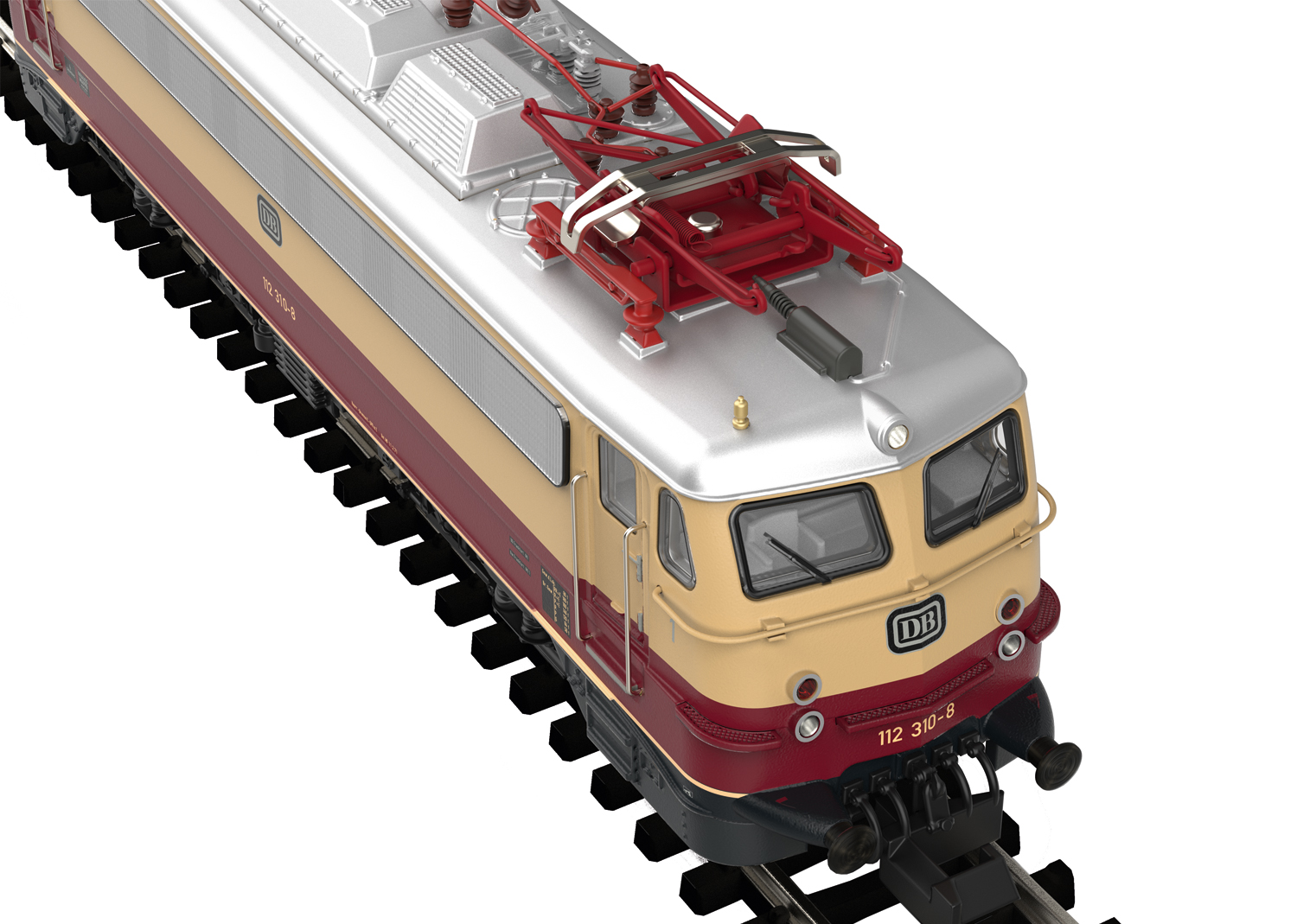 Vorbild: Einheits-Elektrolokomotive 112 310-8 der Deutschen Bundesbahn (DB). Schnellfahrlokomotive mit aerodynamischer Front, mit der sogenannten "Bügelfalte". Grundfarbgebung in Purpurrot/Elfenbein. Mit umlaufender Regenrinne, Schürze und Pufferverkleidung. Betriebszustand um 1971 für den TEE "Rheinpfeil". Einsatz: Personenzüge im Fernverkehr und gelegentlich auch im Nah- und Güterverkehr.
