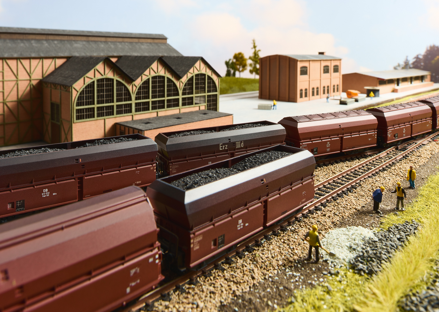Vorbild: 3 vierachsige Selbstentladewagen der Bauart kkt 57 der Deutschen Bundesbahn (DB). Ausführung mit zwei Entladeklappen je Längsseite und stirnseitiger Bremserbühne. Wagen mit Drehgestellen der Bauart Minden-Dorstfeld. Eingesetzt zum Transport von nässeempfindlichen und nässeunempfindlichen Gütern. Betriebszustand der 1960er Jahre.