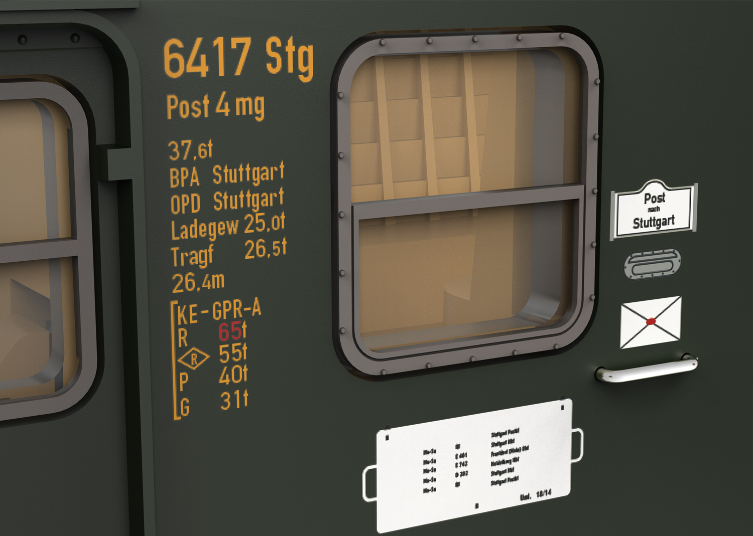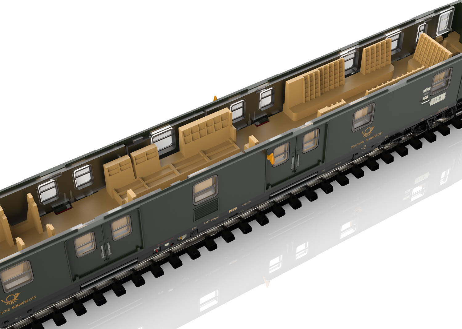 Vorbild: Postwagen der Bauart Post 4mg-bI/26, in der Ausführung der Deutschen Bundespost (DBP) mit dem Wagenlauf Stuttgart-Frankfurt-Heidelberg-Stuttgart. Betriebszustand im Jahr 1963.